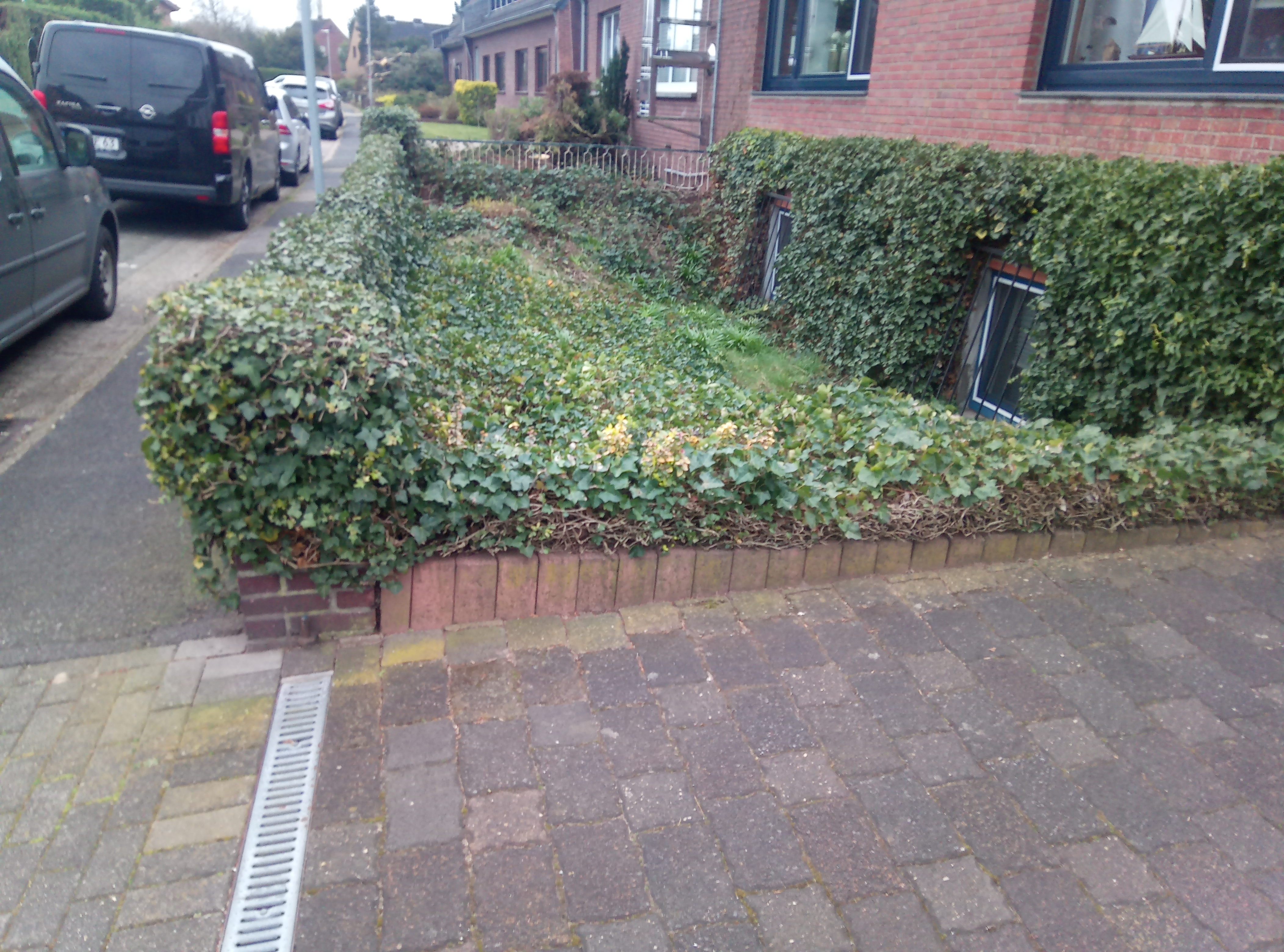 Der komplette Vorgarten wurde durch Efeu überwuchert, der Boden war stark abschüssig und die Pflege sehr aufwendig, da die Fenster mehrfach jährlich befreit werden müssen.