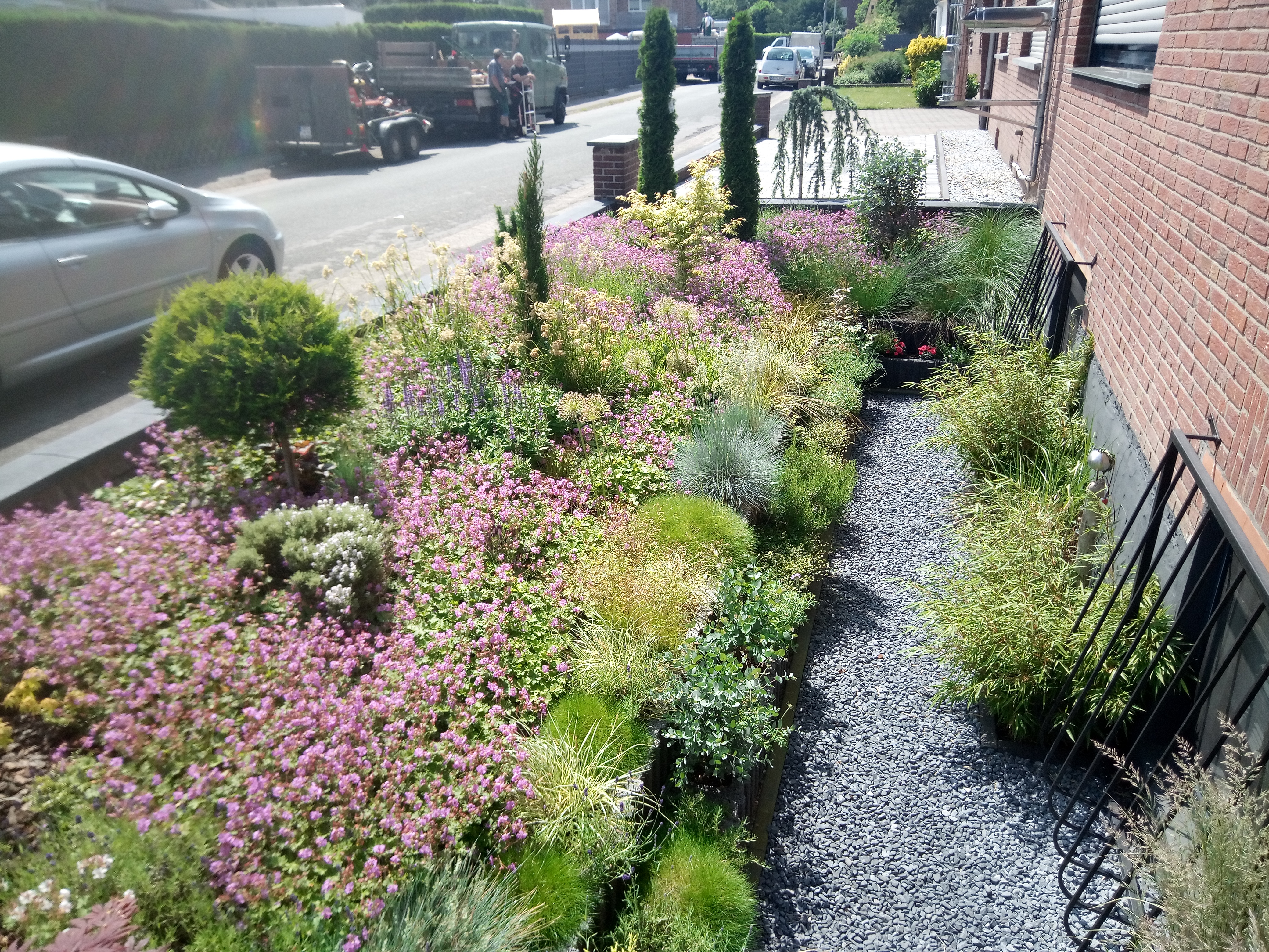 Der gleiche Vorgarten etwa ein Jahr später, der Efeu wurde durch eine Mischung aus Stauden und Gehölzen ersetzt. Der Hang wird durch große Pflanzsteine gehalten. Leider nicht zu erkenne ist eine Vielzahl an Bienen die den blühenden Storchschnabel genießen.