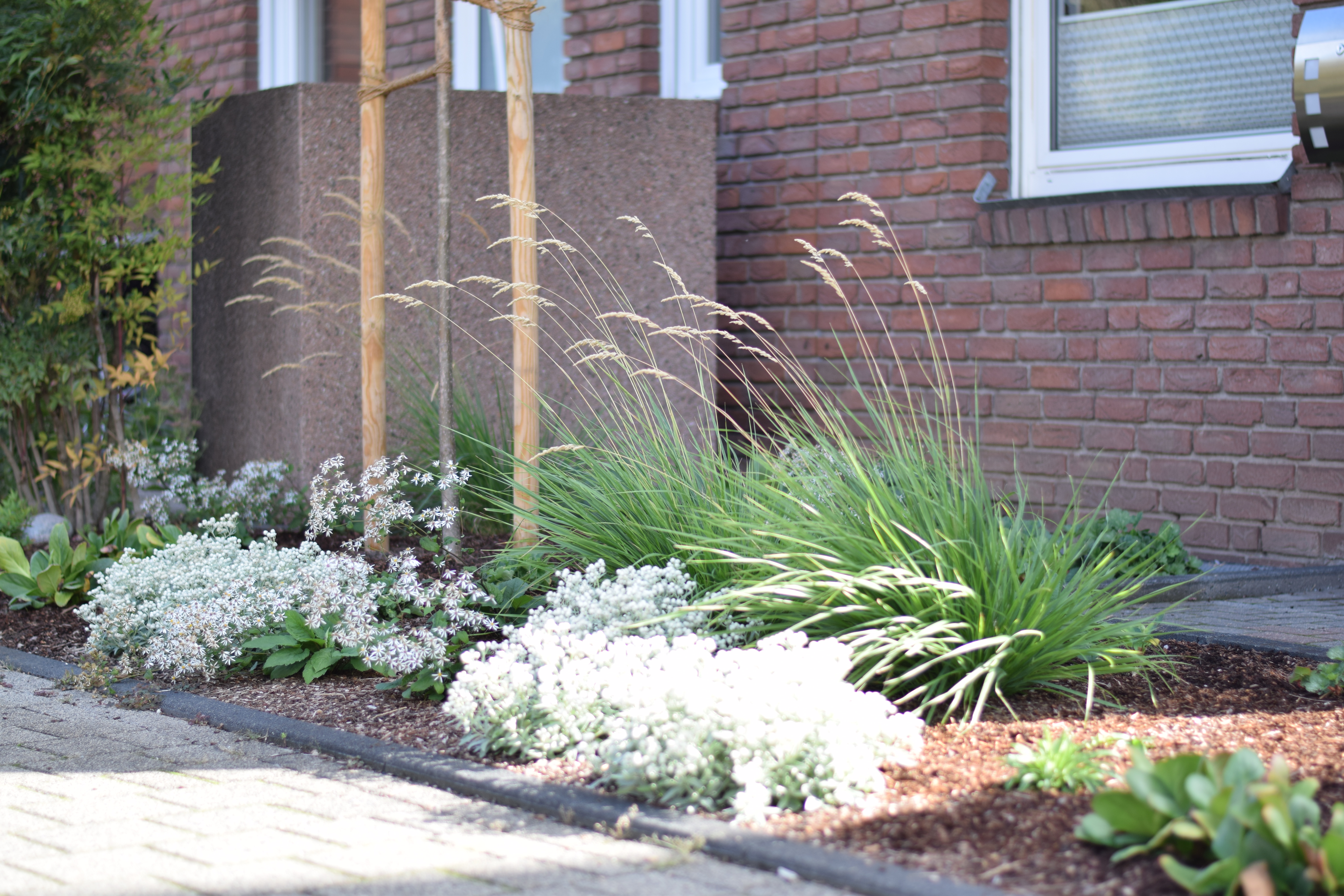 Vom Kunden wurde ein möglichst weißes Vorgartenbeet gewünscht. Auch dieser Wunsch konnte erfüllt werden, während ein Großteil der Pflanzen Insektenförderlich sind.